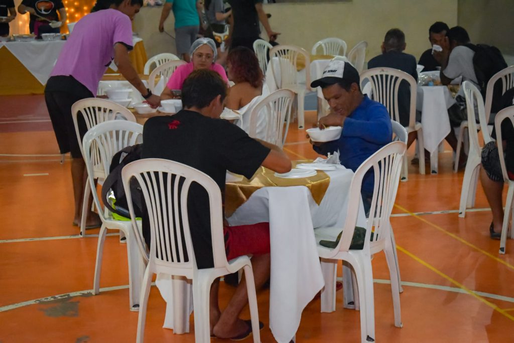 A igreja evangélica Ministério Internacional da Restauração (MIR) – Setorial Norte-Leste, no bairro Jorge Teixeira, realizou, na noite desta sexta-feira (22/12), uma ação social com pessoas em situação de rua, em uma escola da região, com a entrega de doações de roupas, kits de higiene e refeições.